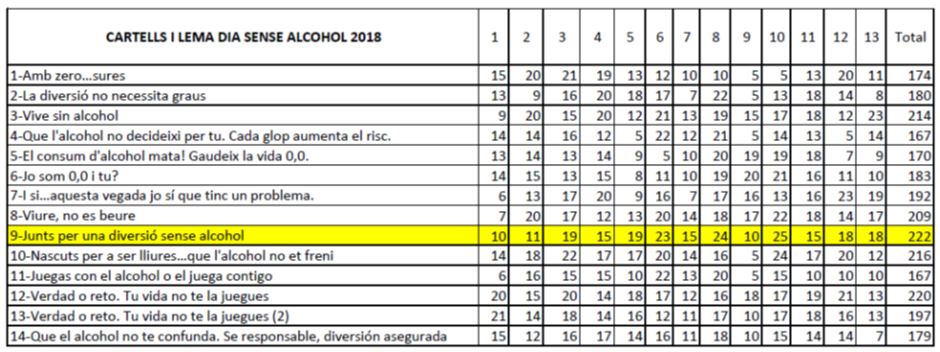 El passat 2 d’octubre a la reunió de la Comissió implicada en el consum perjudicial i trastorn per consum d’alcohol a l’Atenció Primària de les Illes Balears cada persona membre del jurat va avaluar de forma individual els 14 cartells rebuts de 8 centres de salut i unitats de suport de les Illes Balears.