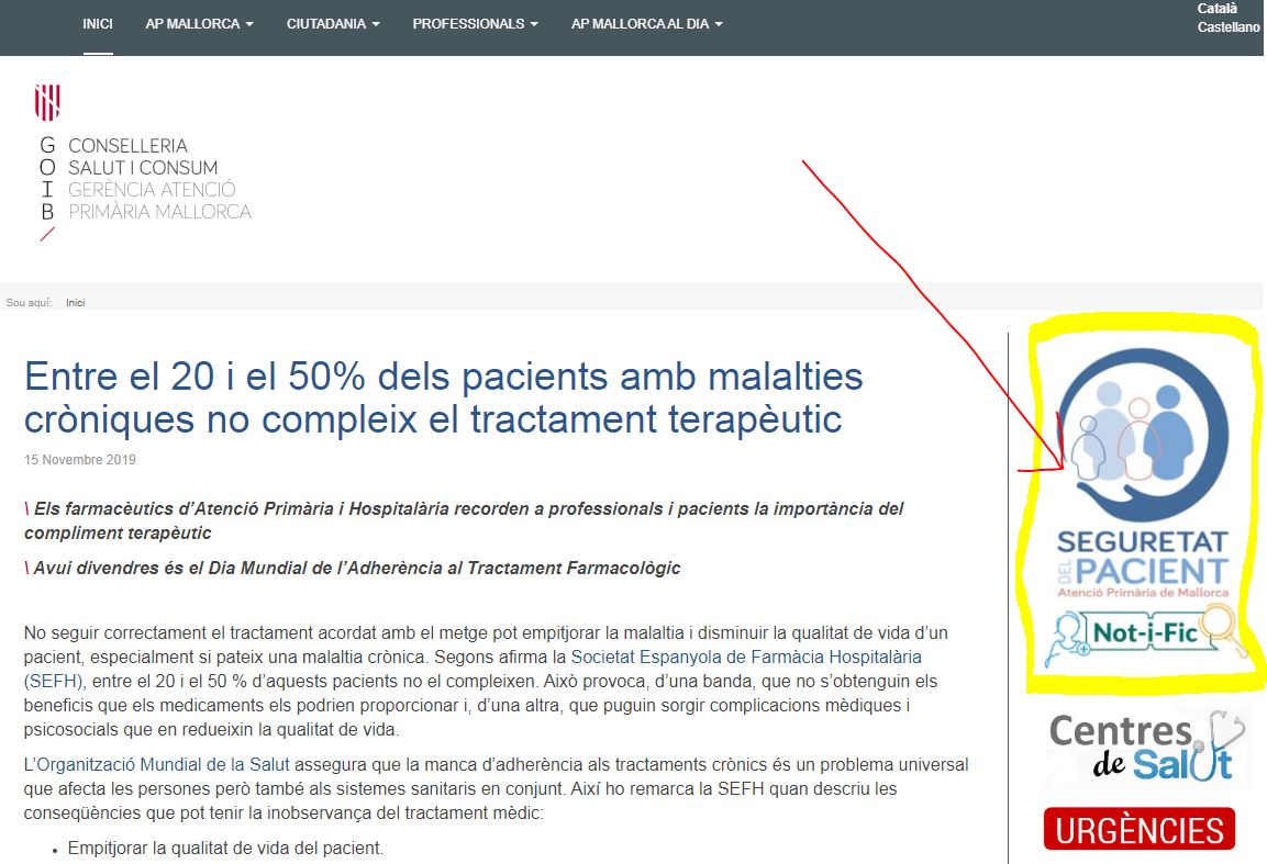 Desde julio de 2019, los profesionales de Atención Primaria de Mallorca pueden emplear Not-i-fic, un sistema de notificación de incidentes y aprendizaje, compartido con el Hospital Universitario Son Espases que permite mejorar la seguridad del paciente desde el análisis de situaciones, problemas e incidentes que se hayan producido o puedan producir daño a los pacientes. Es necesario que este aplicativo se nutra de las notificaciones de todos los profesionales de Atención Primaria de Mallorca, para que nos ayude a conocer los puntos débiles del sistema y qué factores han contribuido a la falta de seguridad. Con el objetivo de establecer medidas específicas de mejora que nos ayuden a evitar que estas situaciones se repitan.