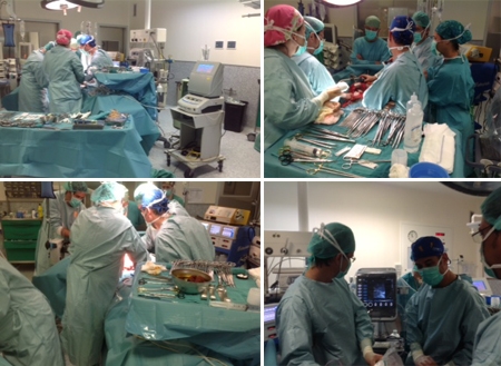 A continuació, i ja en el bloc quirúrgic, es va realitzar la cirurgia programada del pacient comentat en la sessió, una hepatectomía esquerra ampliada, duta a terme pels Drs. Morón cap de secció de la Unitat Hepatobiliar de l'Hospital Universitari de Son Espases, Giordano, adjunt del servei de cirurgia de l'HGMO i Alcaide, cap del servei de cirurgia de l'HGMO. La cirurgia va transcórrer sense incidències, posteriorment el pacient va passar a la UCI para a les atencions postoperatòries immediates i, finalment, a la planta de cirurgia on va evolucionar satisfactòriament sent donat d'alta set dies després de la intervenció quirúrgica. Actualment, després de sis mesos des de la realització del procediment, el pacient es troba en perfectes condicions.